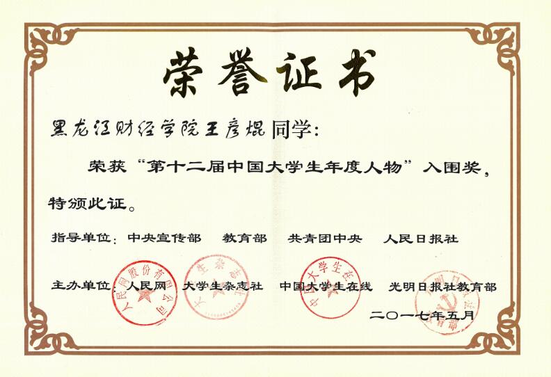 我院学生王彦焜荣获“第十二届中国大学生年度人物”入围奖