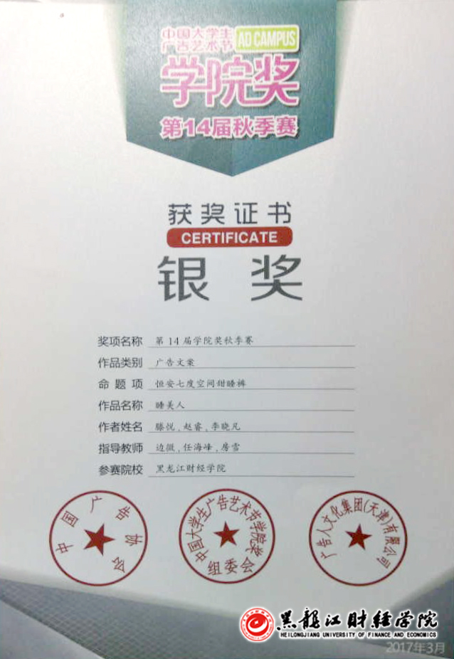 由中国广告协会主办,广告人文化集团承办的第14届中国大学生广告艺术节学院奖秋季赛落下帷幕。我院人文科学系广告学专业学生斩获89个奖项,取得不俗成绩。其中银奖1项,优秀奖48项,佳作奖39项,提名奖1项。人文科学系广告学专业教师边微、房雪和任海峰荣获“杰出指导教师”称号。