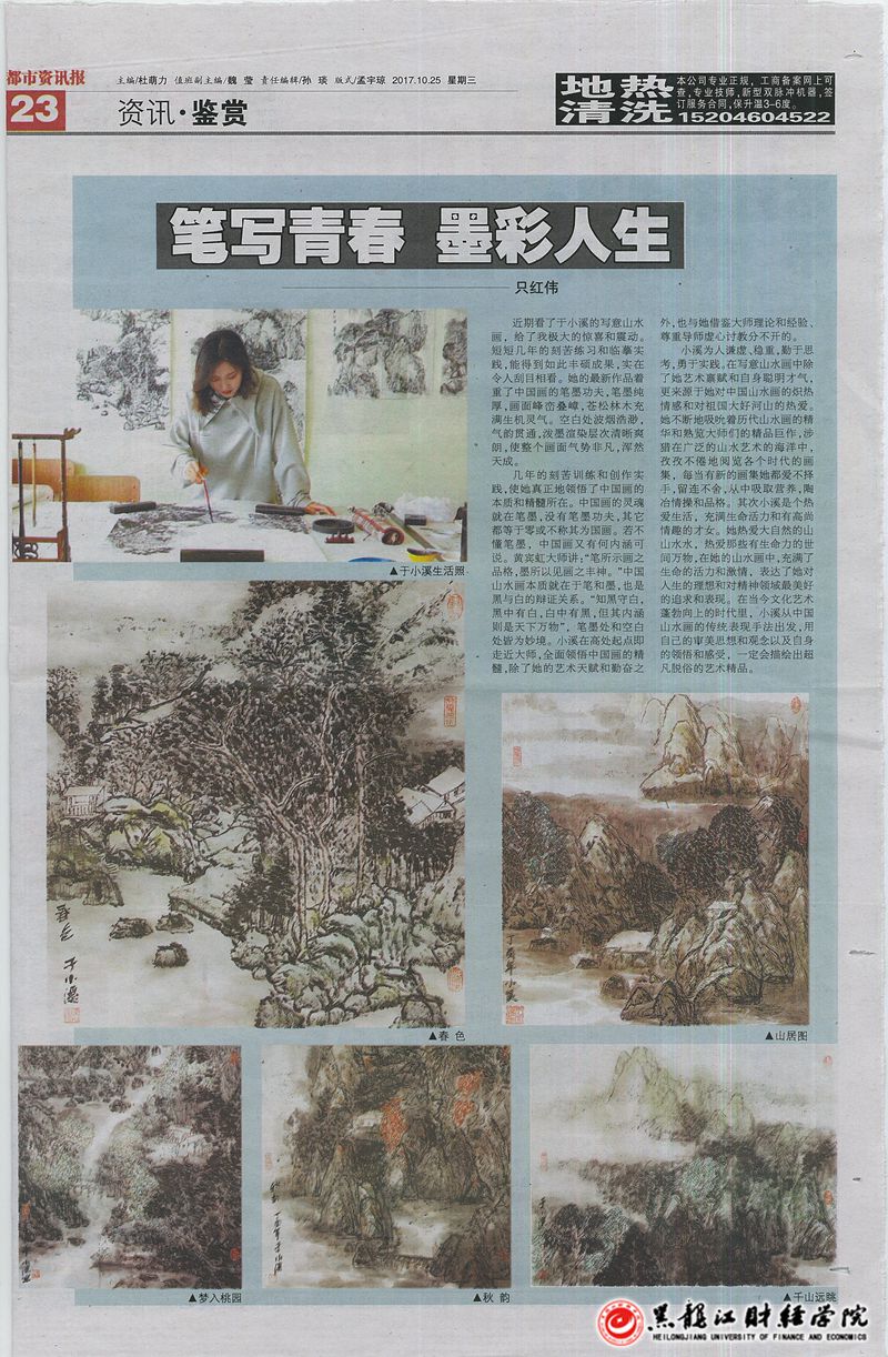 2017年10月25日,都市资讯报全版专题报道了知名画家只红伟对我院艺术系2015级环境设计专业学生于小溪的创作事迹评语。