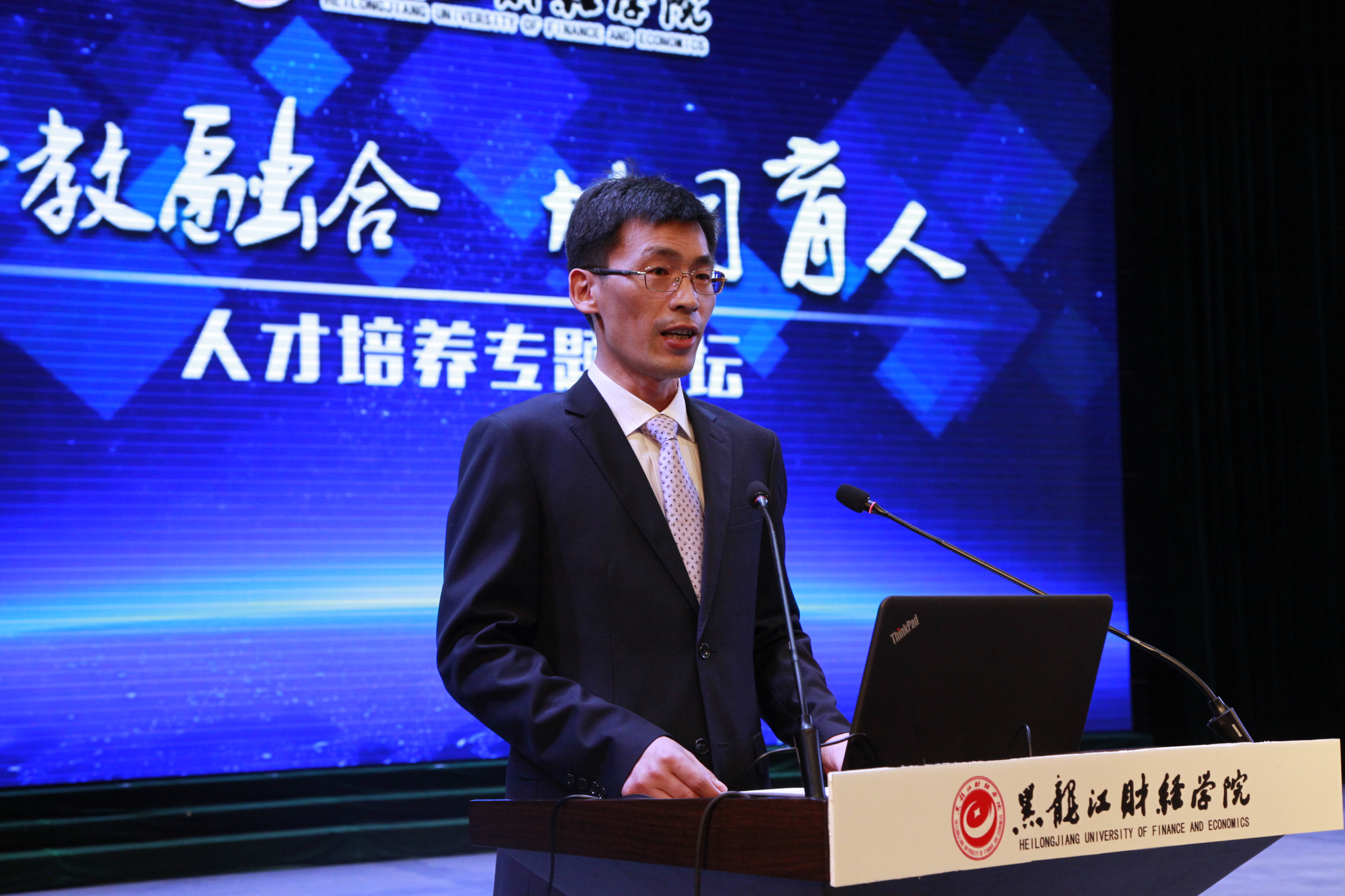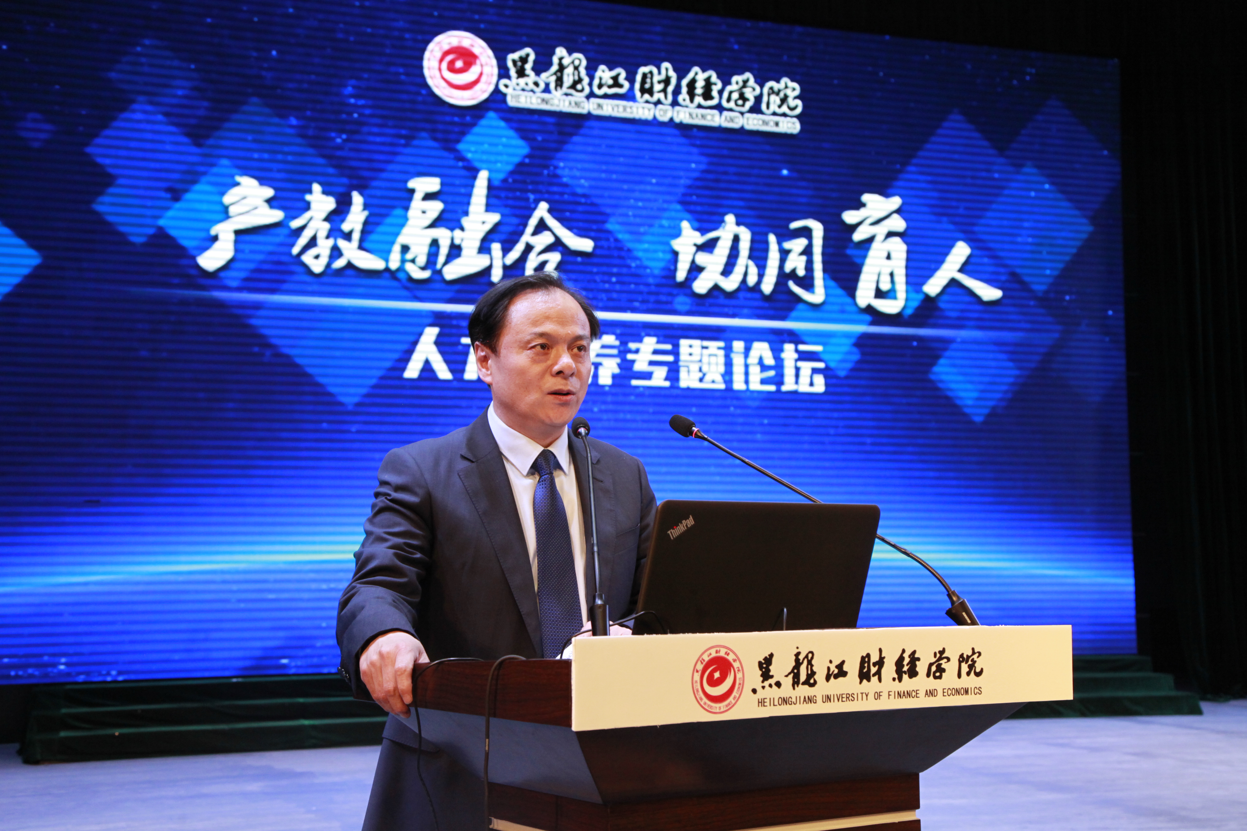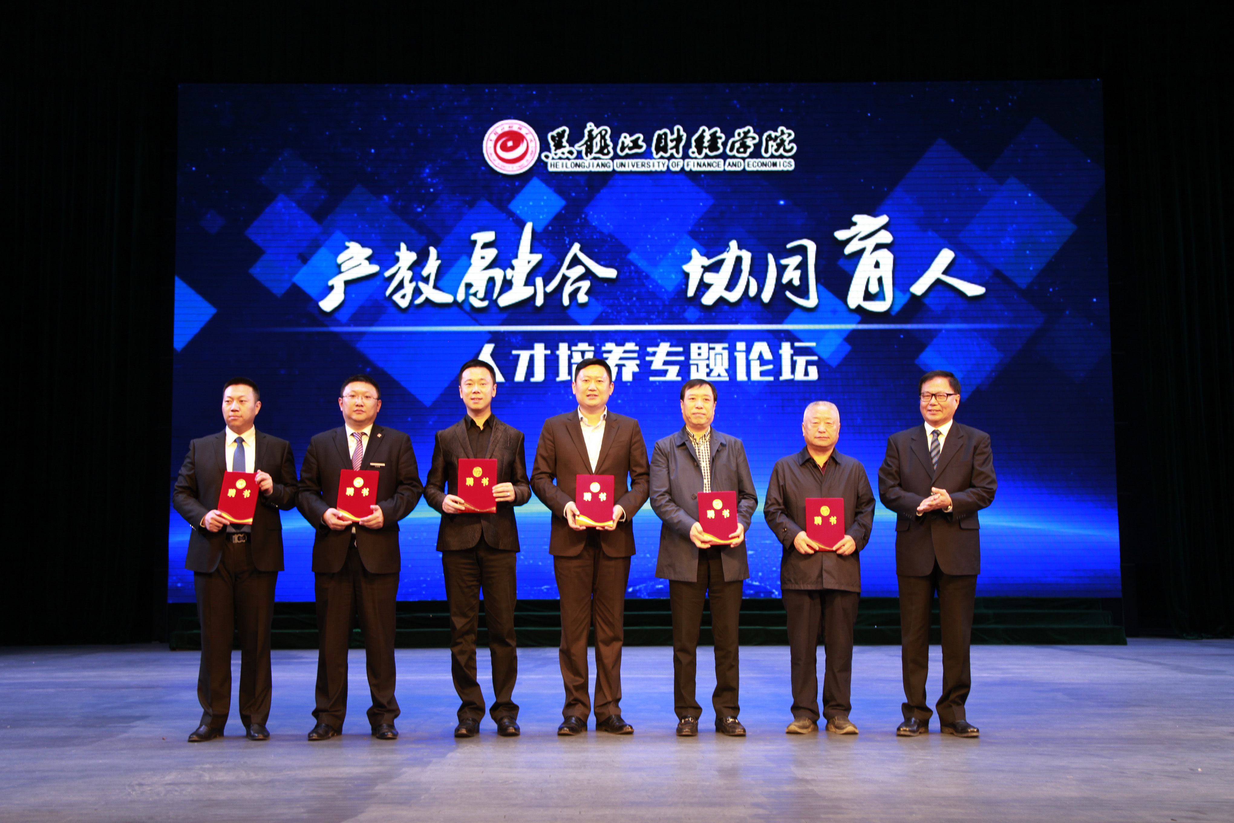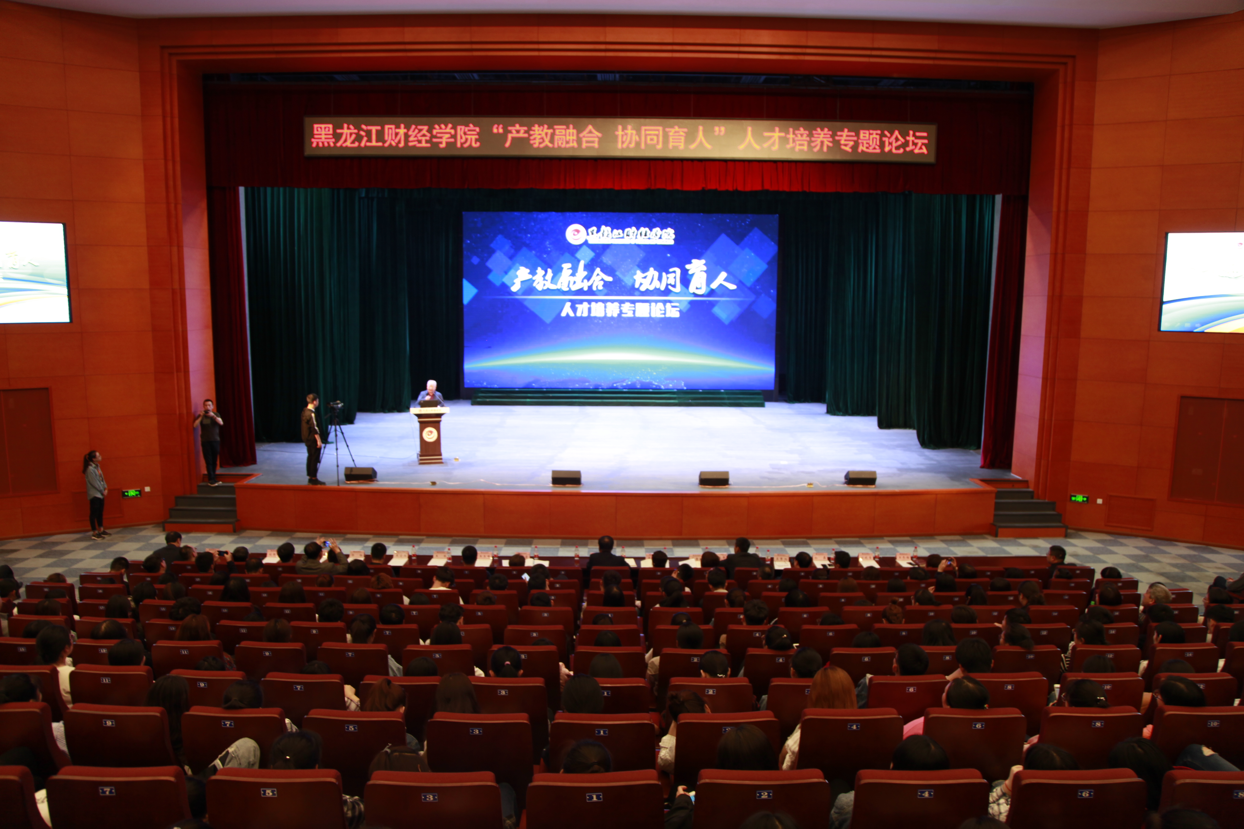 为深入贯彻落实国家相关文件精神,探索产教融合、协同育人的人才培养模式,加快推进我院产教融合、协同育人进程,4月25日下午,黑龙江财经学院“产教融合 协同育人”人才培养专题论坛在音乐厅隆重举行,邀请哈尔滨三五味业集团董事长王军、全国十佳律师孟繁旭、哈尔滨焦视眼科医院董事长焦宏伟、黑龙江省标识行业协会创始人孙磊、中意人寿黑龙江分公司高级总监郭杨、江海证券松北营业部刘晓雪共六位知名企业家来院作报告,院长魏兆胜等学院领导,各单位党政负责人、教师及1000余名学生代表参加了论坛。论坛由毕业生就业指导中心主任郭海峰主持。