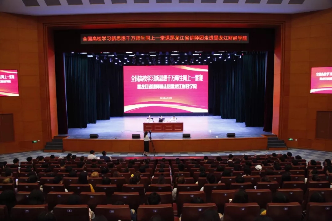 6月15日下午,全国高校学习新思想千万师生同上一堂课黑龙江省讲师团走进黑龙江财经学院专场在我院音乐厅举行,我院无课教师和学生代表近千人聆听了此次宣讲,并通过学院官方微博一直播平台进行实时直播。宣讲活动由院长助理李宪平主持。本次宣讲由哈尔滨师范大学马克思主义学院院长段虹、黑龙江大学水利电力学院团委书记谭蕾主讲。宣讲团成员紧扣习近平新时代中国特色社会主义思想,围绕习近平总书记在北京大学师生座谈会和纪念马克思诞辰200周年大会上重要讲话精神,为我院师生带来了一堂精彩的讲座。