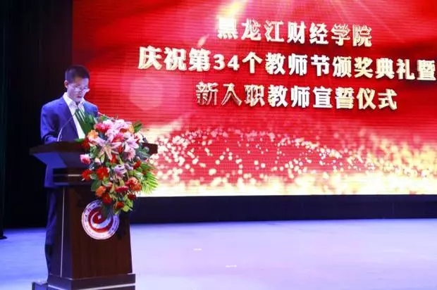 典礼在齐唱国歌声中拉开序幕,大屏幕播放了学院2017-2018学年度教学质量奖、优秀教师、优秀辅导员的获奖名单。党委书记裘杰为获得学院2017-2018学年度教学质量奖获奖者颁发了奖金、证书,魏院长为荣获学院2017-2018学年优秀教师、优秀辅导员获奖者颁发了奖金证书,学生代表向获奖者敬献了鲜花。会上,获奖教师代表会计系教师、学生代表经济系金融学专业学生刘洋依次上台发言,佟伯承老师在发言中回顾了自己从教奋斗历程,分享了自己在守好三尺讲台、奉献教育事业的收获与喜悦,激励青年教师奋发图强、无私奉献,教书育人,爱心和尊重铸就学生们飞翔的翅膀,饱含了着对学生的关爱之心、对学校的感激之情。刘洋同学对辛勤耕耘的老师们致以节日的祝福,诚挚感谢老师们的谆谆教诲,并决心要以出色的表现回报龙财,用热情与智慧和敬爱的老师们共同创造龙财更加美好的明天。
