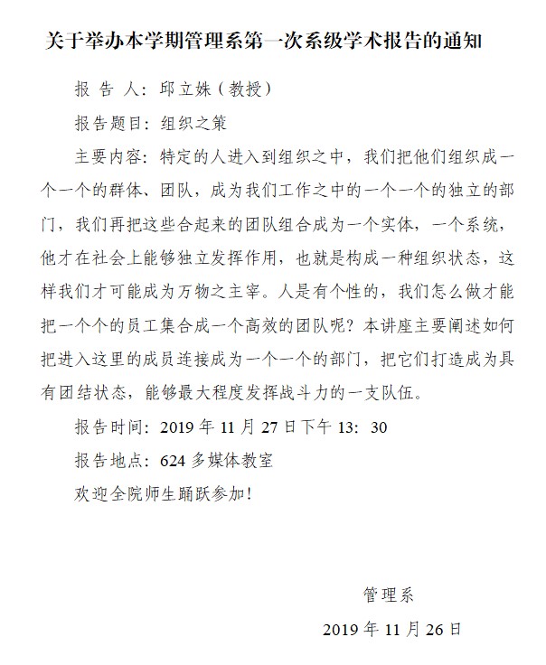 关于举办本学期管理系第一次系级学术报告的通知