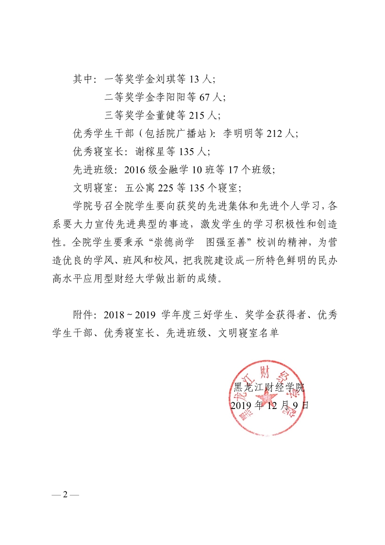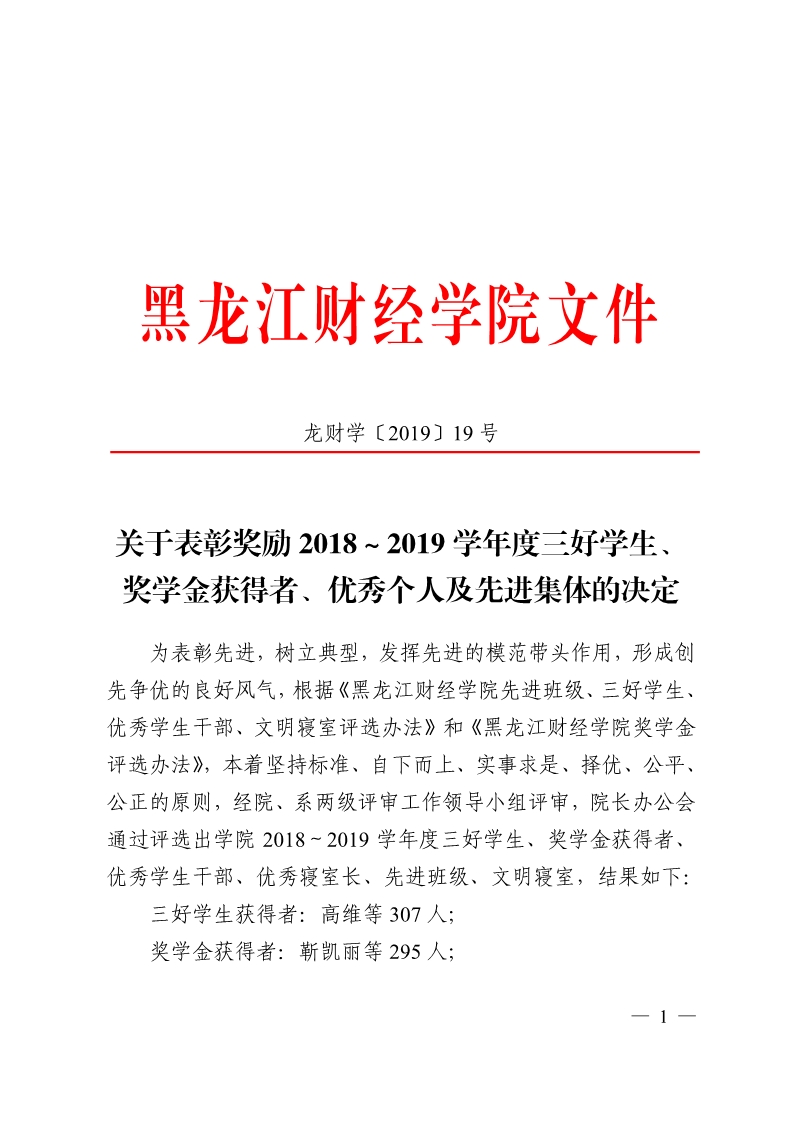 关于表彰奖励2018~2019学年度三好学生、奖学金获得者、优秀个人及先进集体的决定