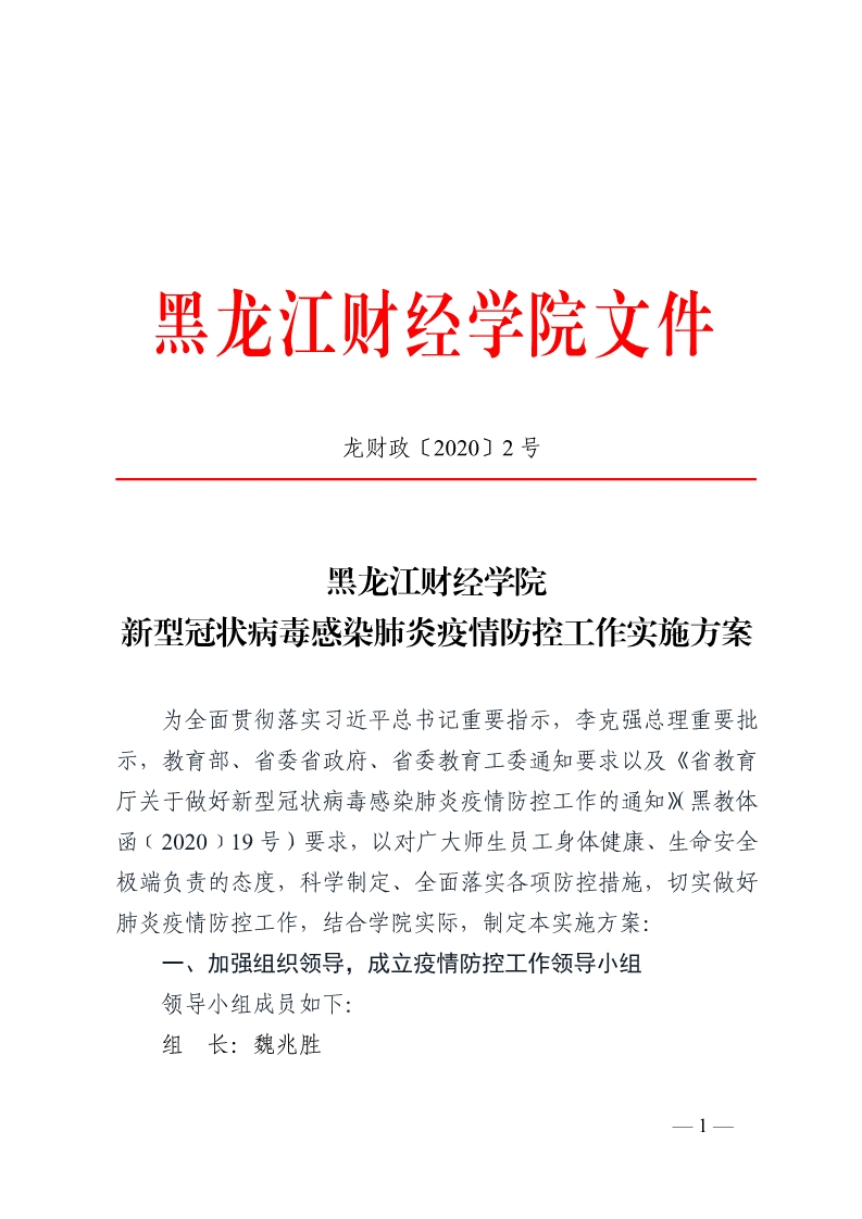 黑龙江财经学院新型冠状病毒感染肺炎疫情防控工作实施方案