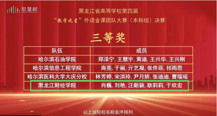 2022年11月13日,由黑龙江省教育厅主办,哈尔滨商业大学承办的2022年黑龙江省高等学校第四届“教学之星”外语金课团队大赛(本科组)黑龙江赛区决赛的获奖名单正式发布,我校通识教育学院大学英语第二教研室肖巍、刘艳、耿莉莉、汪新颖、于欣宏5名教师组成的参赛团队通过教学理念阐述、教学实践展示和问答等环节,与兄弟院校参赛团队同台竞技,经过激烈角逐,最终荣获三等奖。