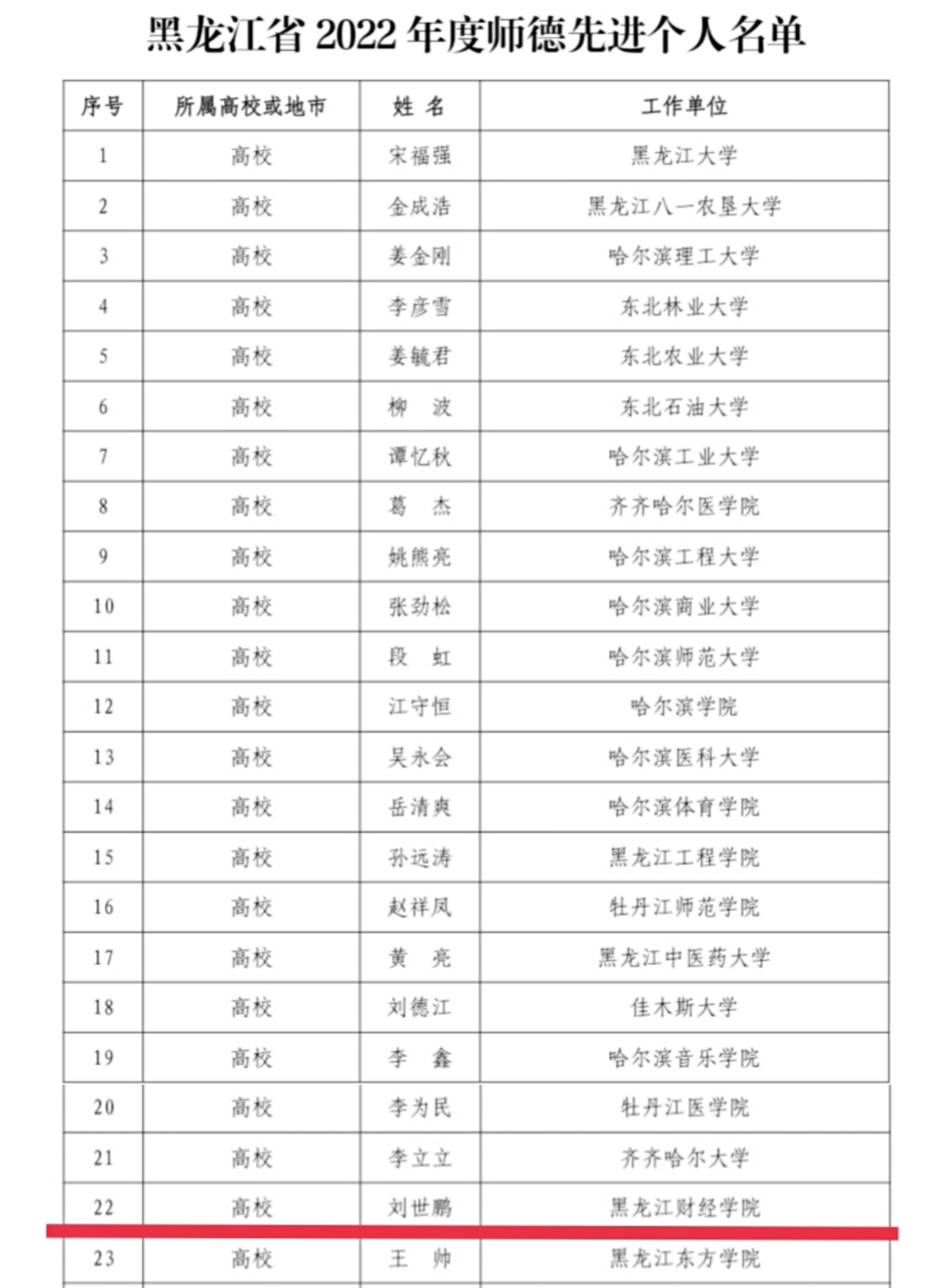 近日,省教育厅组织开展的2022年全省师德先进集体和师德先进个人评选结果公布。本年度高校共评选出师德先进集体20个、师德先进个人35人。我校经济学院副院长、副教授刘世鹏被授予“2022年度全省师德先进个人”荣誉称号。