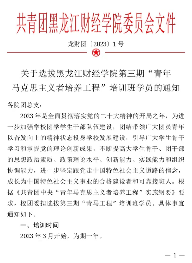 关于选拔黑龙江财经学院第三期“青年马克思主义者培养工程”培训班学员的通知