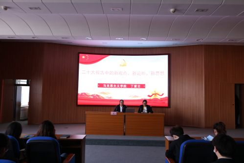 丁教授以《二十大报告中的新观点、新论断、新思想》为题,从党的二十大主题出发,解读十年来“三件大事”“三个务必”等党的二十大报告热词,深刻阐述了习近平总书记在党的二十大报告中提出的一系列新观点、新论断、新思想、新战略、新要求,全面解读与重点阐述相结合,使全体同学对党的二十大精神有了更深刻的理解。她强调,全体同学应做好党的理论研究和宣传工作,推动新时代党的创新理论入脑入心,深刻领会习近平新时代中国特色社会主义思想的丰富内涵,切身落实好“不忘初心、牢记使命,谦虚谨慎、艰苦奋斗,敢于斗争、善于斗争”的精神,做有理想、敢担当、能吃苦、肯奋斗的新时代好青年。