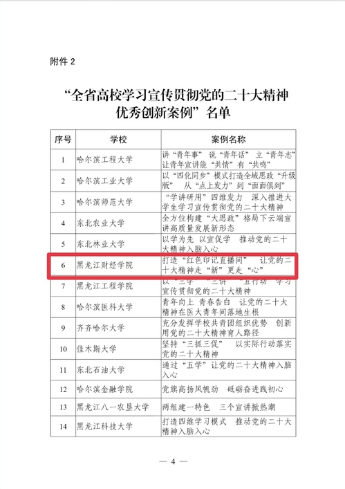 近日,省委教育工委下发了《关于公布学习宣传贯彻党的二十大精神创新案例评选结果的通知》,黑龙江财经学院申报的《打造“红色印记直播间”,让党的二十大精神走“新”更走“心”》入选“全省高校学习宣传贯彻党的二十大精神优秀创新案例”。本次共评出“全省高校学习宣传贯彻党的二十大精神最佳创新案例”10个、“全省高校学习宣传贯彻党的二十大精神优秀创新案例”30个。