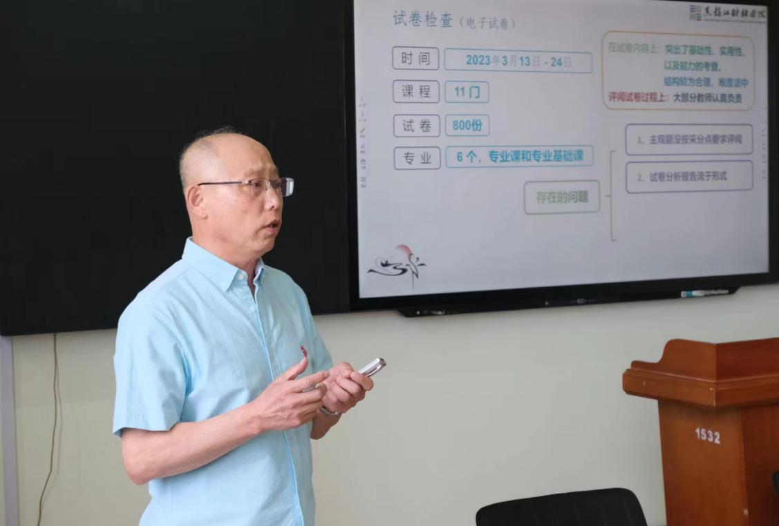 张大维教授从听评课及试卷检查情况方面向与会教师做了专业数据分析反馈。在听课情况反馈中,张教授分别从职称、年龄、性别三结构和备课、讲解、板书三技能共六个维度做了分类数据结果分析。同时,张教授提出教师应在教学中把握好“三个层次”、准备好“三桶水”、做好“三个开始”,并在备课中要考虑“三个问题”的建议。张教授的督导情况反馈分析有理有据、专业细致,所提出的建议全面深入、针对性强,如同一场别开生面的教学观摩课,令教师们受益匪浅。