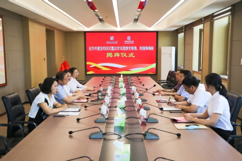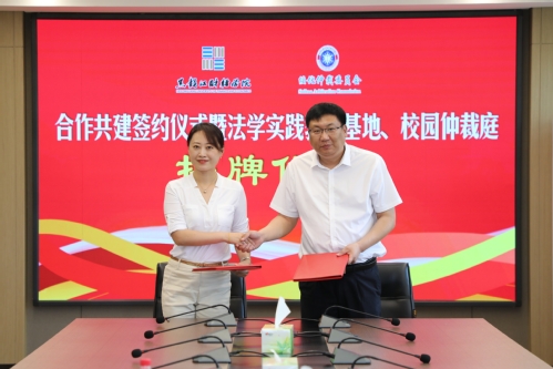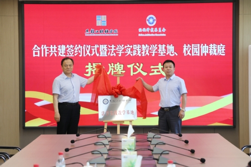 会上,于长福与韩学平为“黑龙江财经学院法学实践教学基地”揭牌,人文学院院长张雅秋与绥化仲裁委员会秘书长、办公室主任孙兵签订了合作共建框架协议。