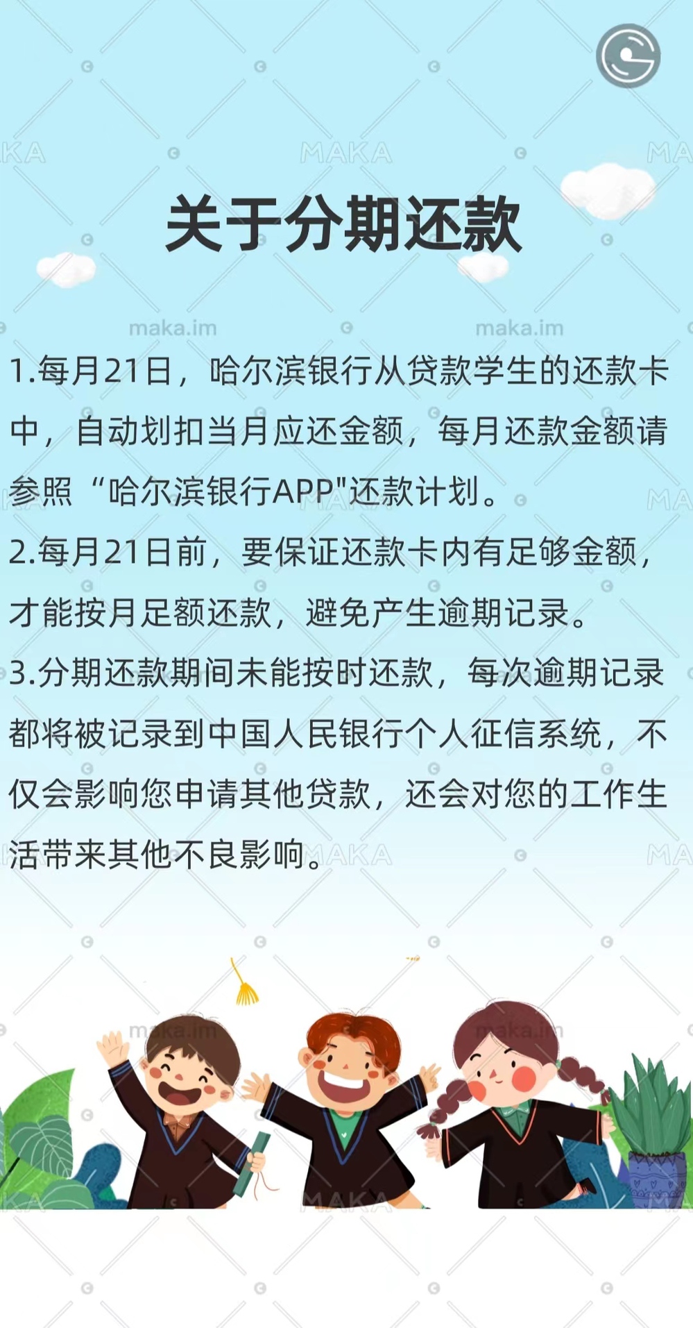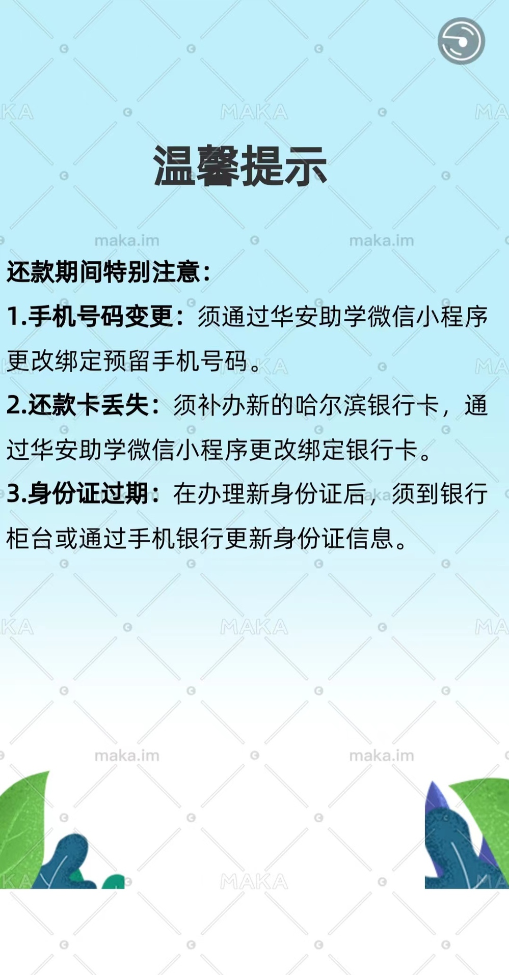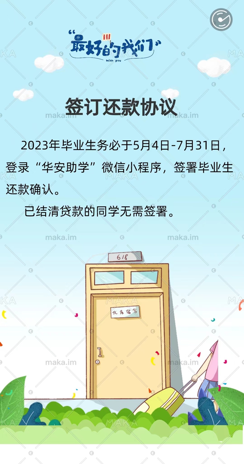 请未全额结清助学贷款的2023届毕业生,在5月31日前,登录“华安助学”小程序,及时签署“还款确认书”。还款的流程和注意事项附后,请大家自行查看。