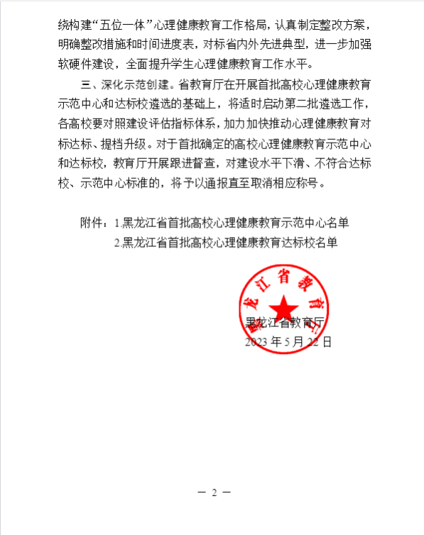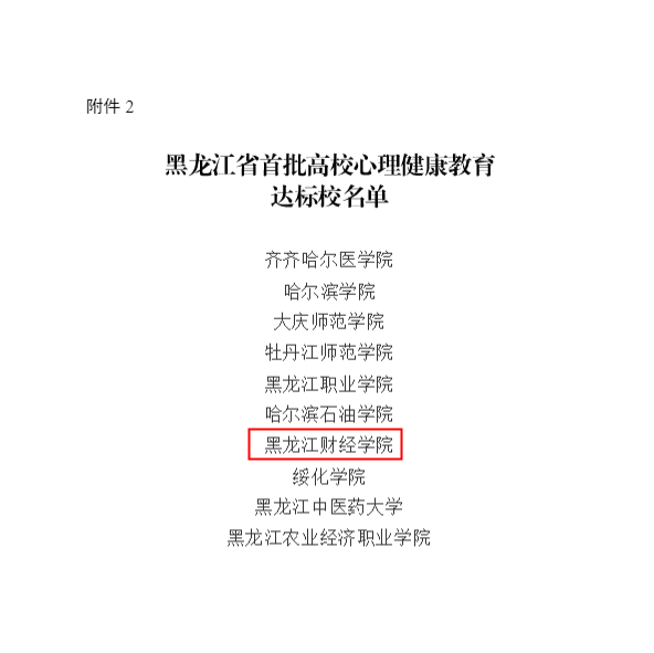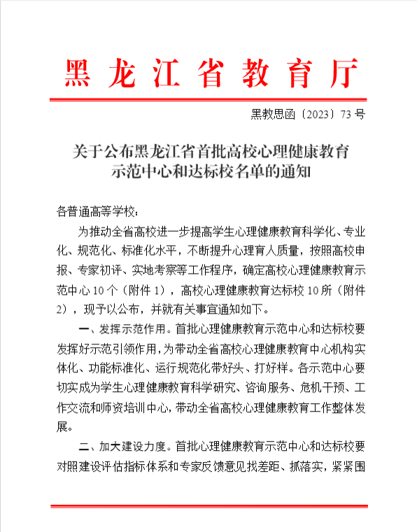 近日,黑龙江省教育厅发布《关于公布黑龙江省首批高校心理健康教育示范中心和达标校名单的通知》,经学校申报、省内外专家线上初评、线下实地考察、省教育厅研究通过,共遴选心理健康教育示范中心10所,心理健康教育达标校10所。我校成功获批“黑龙江省首批高校心理健康教育达标校”荣誉称号。