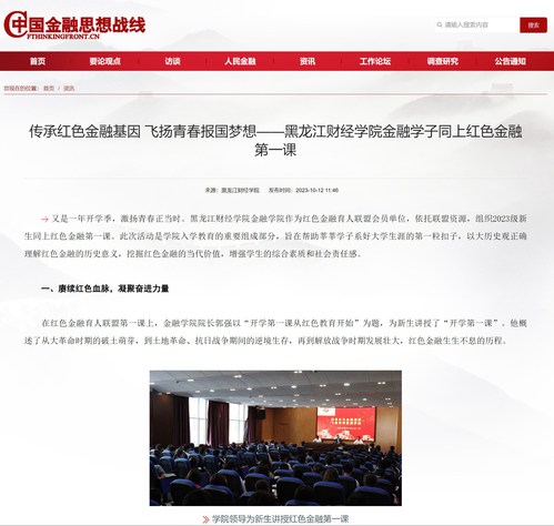 近日,中国金融思想战线网在资讯板块专题报道我校金融学子同上红色金融第一课。中国金融思想战线网由国家金融监督管理总局主管,中国金融思想政治工作研究会主办,以社会主义核心价值观为价值引领,紧紧围绕金融思想和金融文化的发展主线,用文字、图片、视频、客户端等多种手段,记录中国特色社会主义金融事业的发展历程与丰硕成果,发布金融党建思想文化资讯,讲好金融业的“中国故事”、传递金融业的“中国价值”。