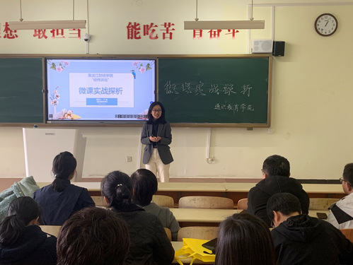 首先,于丽老师结合参加学院“2022年微课大赛”和“第九届黑龙江省高校微课教学比赛”的经历,介绍了对微课的认识。微课是由一个个教学片段组成的完整教学的一部分,是一个相对独立却又互相联系的教学资源,是一种新型的教学模式和教学模块。我国最早提出微课概念的胡铁生教授形容微课是以微型教学视频为主要载体,以某一个教学重点或者教学难点为例,而展开设计的一种微视频的教学模式。