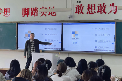 本次学术讲座总共包括四项内容。第一部分,人工智能的发展简史——ChatGPT的前世今生。任海峰副教授带大家一同回顾了人工智能的起源与历史发展,对不同发展时期的标志性人工智能成果进行了讲解,截至2023年已发展到GPT4.0版本,它可以生成自然流畅的对话、问题回答、图像描述、文本翻译等多种自然语言处理任务;第二部分,AI与chatGPT。任海峰副教授提到人工智能与chatGPT的异同以及二者的工作原理,重点就应用领域和未来发展影响进行了分享,预计到2025年后,很多大型企业开始部署AI并投入使用,相信这个时候模型的幻觉、对齐和内容版权问题都得到了很大的改善,企业可以放心使用正式产品,而不是演示或者原型;第三部分,创意变革与市场颠覆——人工智能与广告。这部分主要是讲解AIGC(AI Generated Content 即人工智能创作内容)生成式人工智能对广告的影响,AIGC是继PGC(专业生成内容)、UGC(用户生成内容)之后产生的新型创作模式,其能力远不止于文字输出以及画画本身,其特点是高效的自动化生产,具有智能数据内容孪生、编辑、创作三大能力;第四部分,AI时代下广告行业人才培养。这部分主要分享了广告业的重构、广告人才的自我重建以及目前AIGC工具,如今AIGC的应用可以类比十年前的互联网+,AIGC的应用可以极大地提高广告内容的生产效率和质量,加快广告营销的周期,帮助企业更好地实现营销目标。