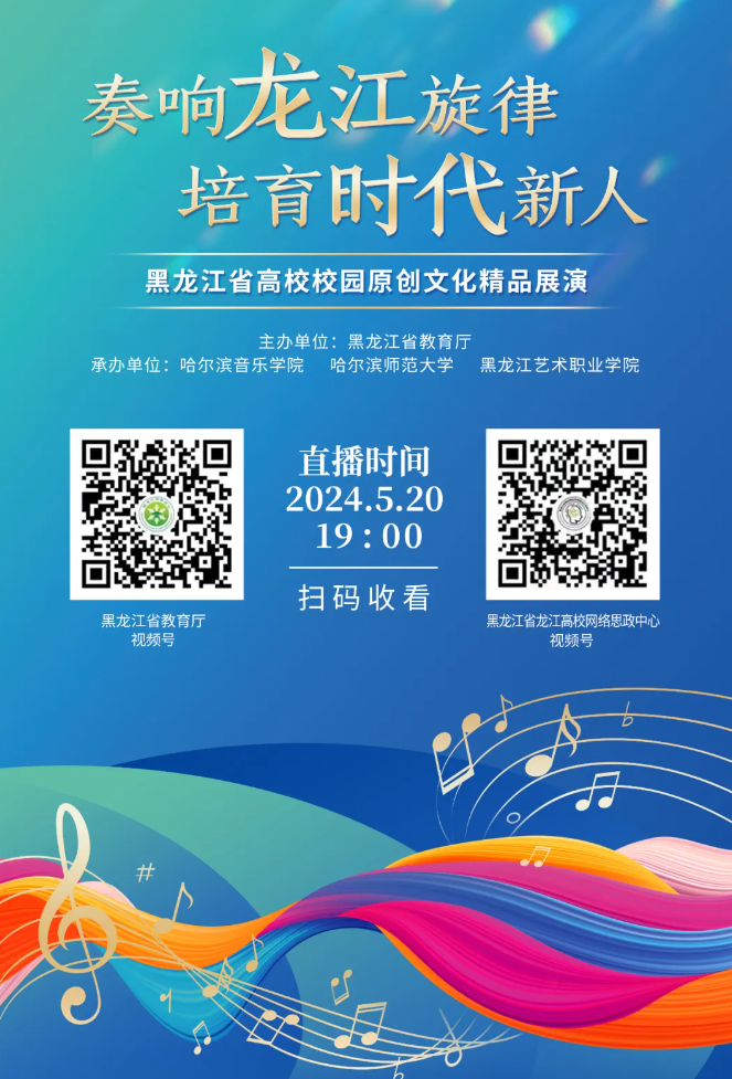 为展现青春风采,黑龙江省教育厅将于5月20日晚7点,在哈尔滨音乐厅举办“奏响龙江旋律 培育时代新人”黑龙江省高校校园原创文化精品展演活动。届时,“黑龙江省教育厅视频号”、“黑龙江省龙江高校网络思政中心”将对活动进行线上直播,欢迎广大师生观看。
