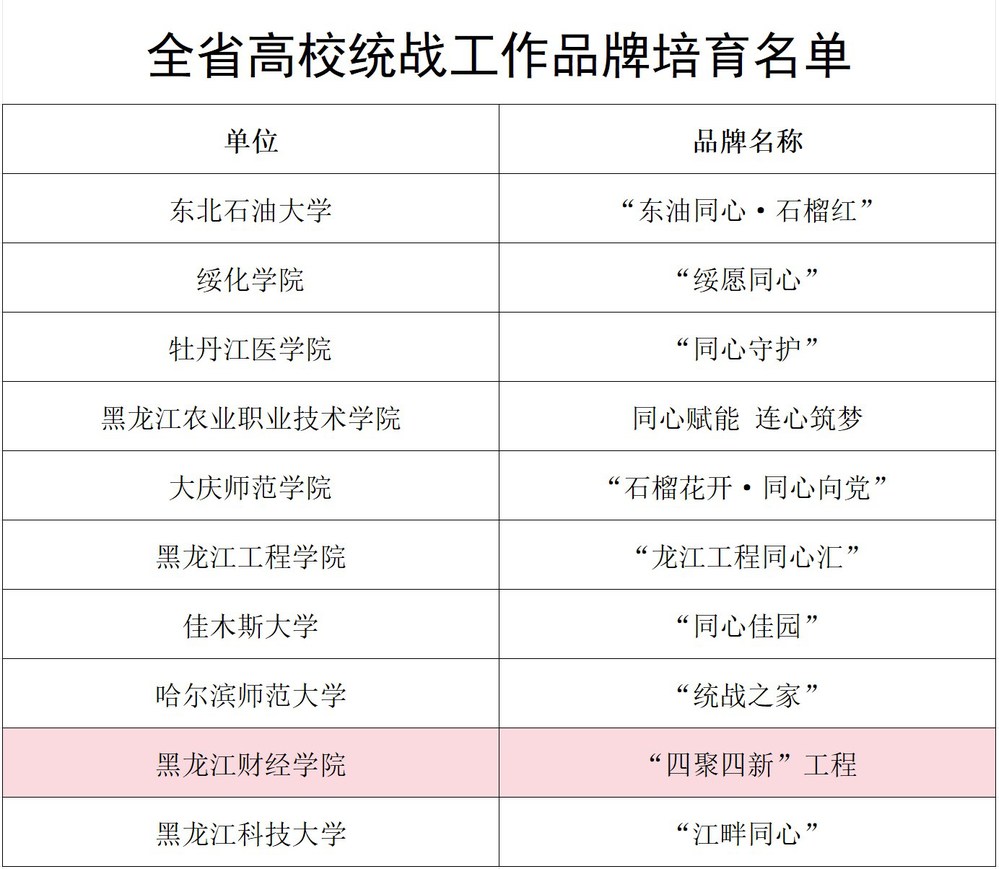 为深入贯彻落实习近平总书记关于做好新时代党的统一战线工作的重要思想,推动全省高校统一战线工作全面提质增效,打造一批具有龙江高校特色的统一战线工作品牌,近日,省委教育工委和省委统战部联合开展了高校统一战线工作品牌评选活动。经学校申报、现场评审、省委教育工委公示,共评选出10个高校统战工作创建品牌和10个高校统战工作培育品牌,我校“四聚四新”工程统战工作品牌获选首批全省高校统战工作培育品牌,是唯一获选的民办本科高校。