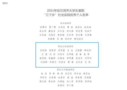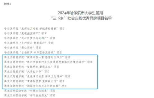 为深入总结交流经验、选树典型宣传、推动引领示范、激励广泛参与、发挥育人实效。团市委通报表扬一批在2024年哈尔滨市大学生暑期“三下乡”社会实践活动中表现突出的优秀单位、优秀团队、优秀个人、优秀品牌项目,我校8个单位荣获2024年哈尔滨市大学生暑期“三下乡”社会实践优秀单位;24个团队荣获2024年哈尔滨市大学生暑期“三下乡”社会实践优秀团队;24人荣获2024年哈尔滨市大学生暑期“三下乡”社会实践优秀个人;7个品牌项目荣获2024年哈尔滨市大学生暑期“三下乡”社会实践优秀品牌项目。