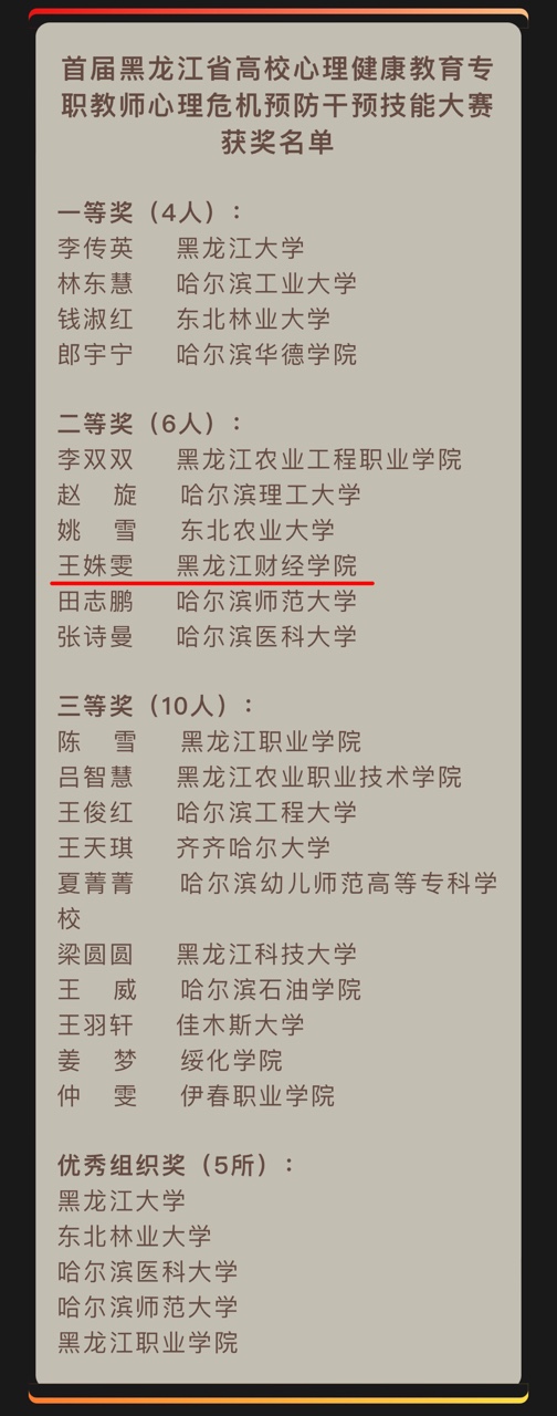 12月11-13日,首届黑龙江省高校心理健康教育专职教师心理危机预防干预技能大赛落下帷幕,我校心理健康教育中心主任王姝雯凭借扎实的专业知识、出色的案例分析能力与精湛的模拟干预技巧,在众多参赛教师中脱颖而出,荣获大赛二等奖。