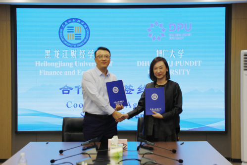 徐雷与王珊珊分别代表黑龙江财经学院与泰国博仁大学,正式签署了校际合作协议。根据协议,两校将在合作办学、教学科研、师生交流及短期研学等多个维度建立长期、稳定的战略合作关系,标志着两校合作进入了崭新的阶段。