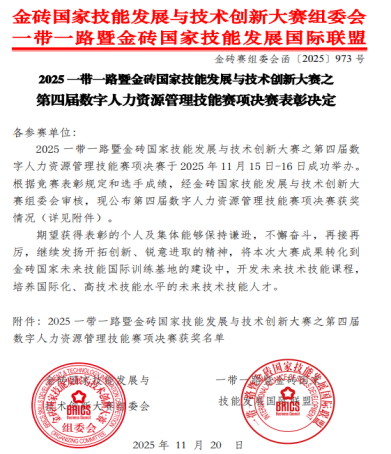 近日,由金砖国家工商理事会中方理事会、一带一路暨金砖国家技能发展国际联盟、中国科协“一带一路”暨金砖国家技能发展与技术创新培训中心联合主办的2025一带一路暨金砖国家技能发展与技术创新大赛第四届数字人力资源管理技能赛项本科组全国总决赛圆满落幕。