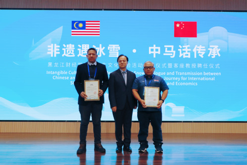 徐雷向跨越三千多公里远道而来的14位马来西亚师生代表致以热烈的欢迎,向即将加入龙财大家庭的马来西亚客座教授表示衷心祝贺。他指出,中国与马来西亚是隔海相望的友好邻邦,两国人文交流历史悠久、底蕴深厚,教育合作更是连接两国青年心灵、携手共创未来的重要纽带。此次文化体验之旅,以非遗为媒、以冰雪为韵,既是一次文化互鉴的生动实践,更是一场友谊传承的温暖相约。期待马来西亚留学生们能与龙财学子深入交流、增进情谊,在后续的联谊晚会中一展才华,在参观研学活动中碰撞思想火花,分享马来西亚的文化精华与青年见解。他表示,聘请两位马来西亚杰出学者担任客座教授,将为学校学科专业建设与国际化视野拓展注入宝贵智力支持。学校期待未来与玛拉工艺大学、马来西亚博特拉大学开展更深层次合作,也祝愿马来西亚师生在哈尔滨收获知识与友谊,在黑龙江财经学院度过一段美好难忘的时光。