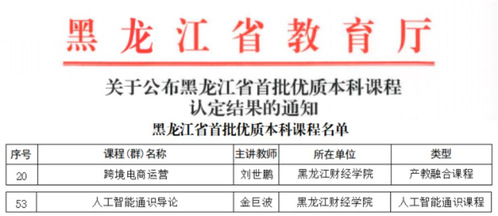 近日,黑龙江省教育厅公布黑龙江省首批优质本科课程认定结果,我校刘世鹏教授主讲的《跨境电商运营》课程、金巨波教授主讲的《人工智能通识导论》分别作为产教融合课程与人工智能通识课程获批立项,标志着学校在课程建设与教学改革方面取得新突破。