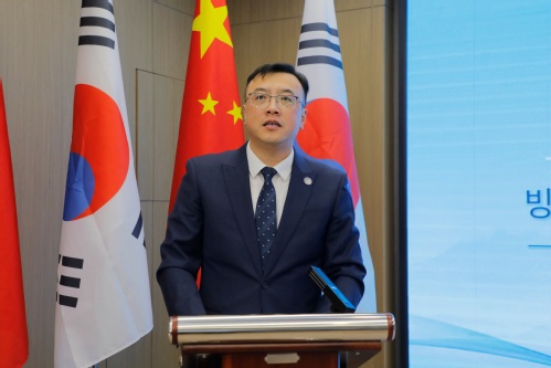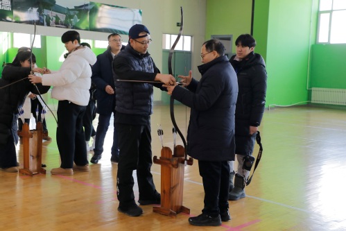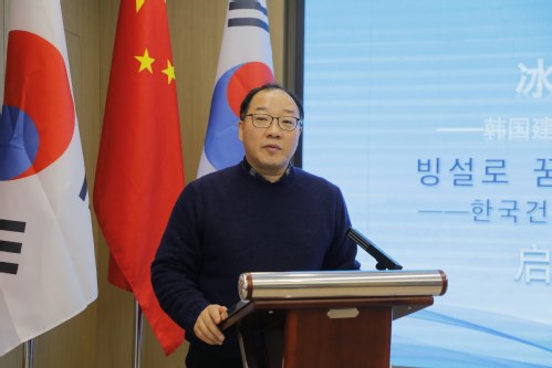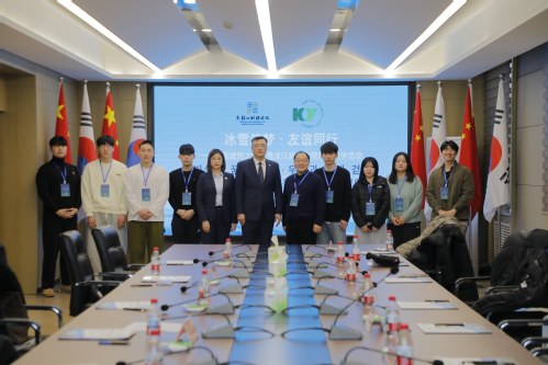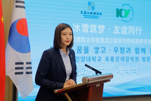 徐雷向远道而来的建阳大学全体师生表示热烈的欢迎。他指出,自建立合作关系以来,两校情谊在多次互访互动中持续深化,尤其是去年4月我校代表团到访建阳大学,受到全希晙院长及同仁的热情接待;同年7月,我校师生赴贵校开展研学活动,收获了宝贵经验与真挚友谊。他强调,冰雪是北国冬日的独特语言,更是传递友谊与梦想的载体。本次研学围绕“冰雪筑梦·友谊同行”主题精心设计了多元内容,希望将中韩友好的共识转化为师生间的真实交流成果,让双方在体验冰雪文化、感受北国风貌的过程中,收获知识、灵感与跨越国界的深厚情谊。他寄语两校同学深入交流、启迪思维、缔结厚谊,共同成为推动中韩友好世代相传的青春力量。