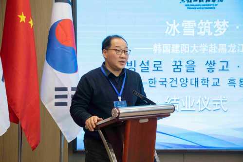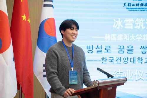 韩国建阳大学学生代表梁峻模分享了研学收获与感悟。他表示,此次研学大家走进中央大街、畅游冰雪大世界、观赏冰灯游园会,沉浸式体验了独具魅力的北国风情,真切感受到了课堂之外别样的成长意义。同时,通过参观黑龙江财经学院的教学设施,近距离接触各类特色项目与优质教学环境,更是开阔了眼界,收获满满。他强调,这段研学时光充实而愉悦,会将研学的收获与回忆珍藏于心,让其成为未来人生道路与职业发展的无限动力。