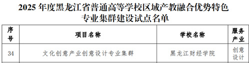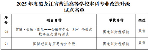 近日,黑龙江省教育厅公布省普通高等学校本科专业改造升级试点及区域产教融合优势特色专业集群建设试点名单,我校金融学、国际经济与贸易2个专业获批省本科专业改造升级试点,文化创意产业创意设计专业集群获批省区域产教融合优势特色专业集群建设试点!这是我校围绕提升专业建设与区域发展匹配度的核心目标,持续优化调整专业结构,强化内涵建设的重要成果,充分体现了我校深化产教融合、服务地方发展的鲜明特色与突出成效。