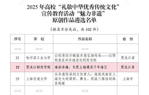 近日,教育部公布了2025年高校“礼敬中华优秀传统文化”宣传教育活动结果,由我校党委宣传部报送的作品《漆语冰魂:当黑土地遇见千年漆艺》成功入选“魅力非遗”类原创作品名单。该类别全国遴选102件,全省仅我校与哈尔滨工业大学入选,实现了我校在该品牌活动中的首次突破。
